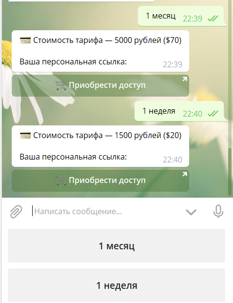 Основной смысл в боте – продажа платных подписок, расценки зависят от длительности доступа: