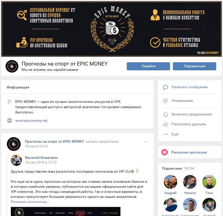 Сервис EPIC MONEY позиционирует себя одним из лучших аналитических ресурсов спортивных событий в СНГ. Основатель и руководитель украинского проекта Василий Кошечкин, а также главный аналитик Андрей Кащеев гарантируют каждому клиенту стабильную прибыль от ставок. В группе ВКОНТАКТЕ даются бесплатные и платные прогнозы на футбол, хоккей, теннис и другие виды спорта. При проведении проверки явных фактов мошенничества выявлено не было, но обо всем по порядку!