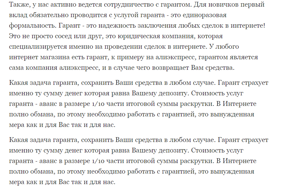 Якобы для безопасности вкладчиков и аналитиков проекта первая раскрутка счета проводится через сервис гарант, такие действия позволяют застраховать от обмана две стороны. По условиям нужно будет оплатить 1/10 часть от суммы выплаты, то есть, если вы вложили 500 рублей, то по инвестициям положено 25000 рублей, выходит, что нужно дополнительно перевести еще 2500 рублей.