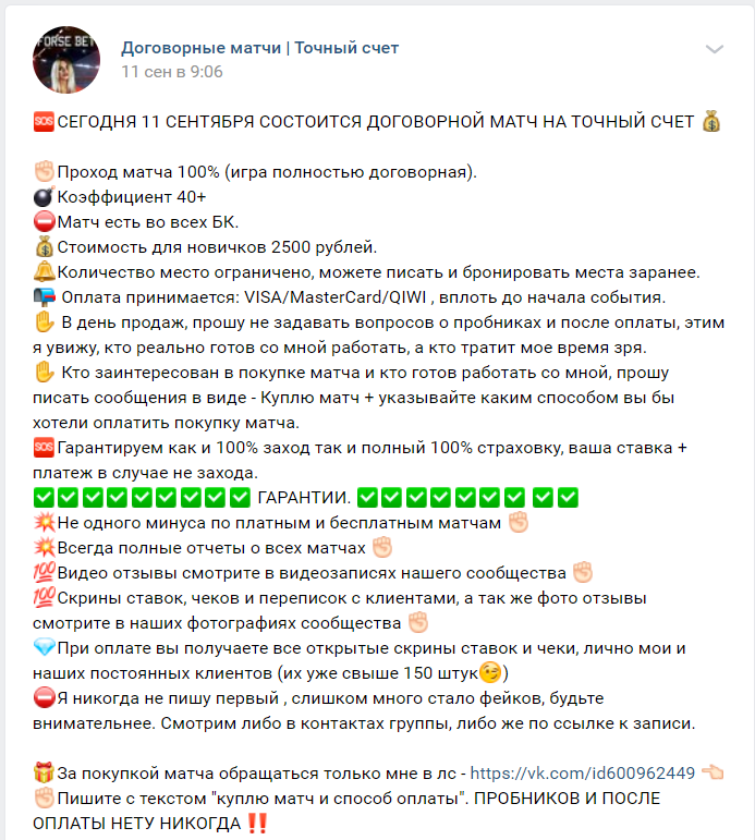 Все больше информации появляется в сети, что купить договорняки в интернете невозможно, а все, кто продает, являются мошенниками, но люди продолжают верить в сказки и приобретать за 2-10 тыс. рублей воздух. Эксперты KAPER.PRO занесли в черный список очередную группу (даже две) ВК Договорные матчи | Точный счет | Forse-Bet.