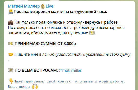Отзывы о каппере Матвее Миллера на канале Telegram