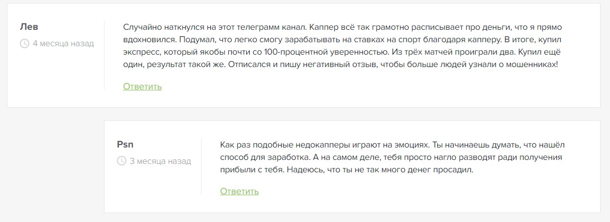 Каких-либо преимуществ сотрудничества с капперами проекта выявлено не было, так как по платным экспрессам большие вопросы к невыполнимым гарантиям, а бесплатные ставки имеют низкую проходимость (причем посты часто корректируются). Еще нужно принять во внимание и тот факт, что представители сервиса имеют доход с проигрышей клиентов, приведенных в букмекерскую контору, то есть им просто невыгодно давать качественный анализ спортивных событий. Если вас обманули на канале TAYAbet в телеграмме, напишите подробный отзыв и поделитесь своим мнением в наших комментариях!
