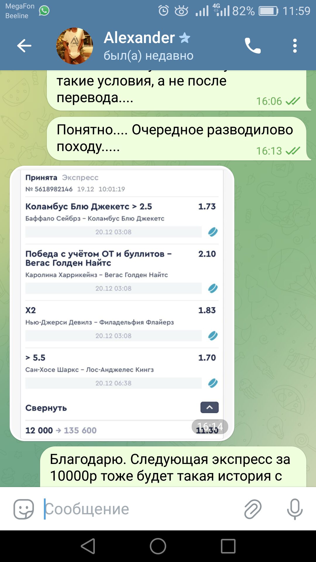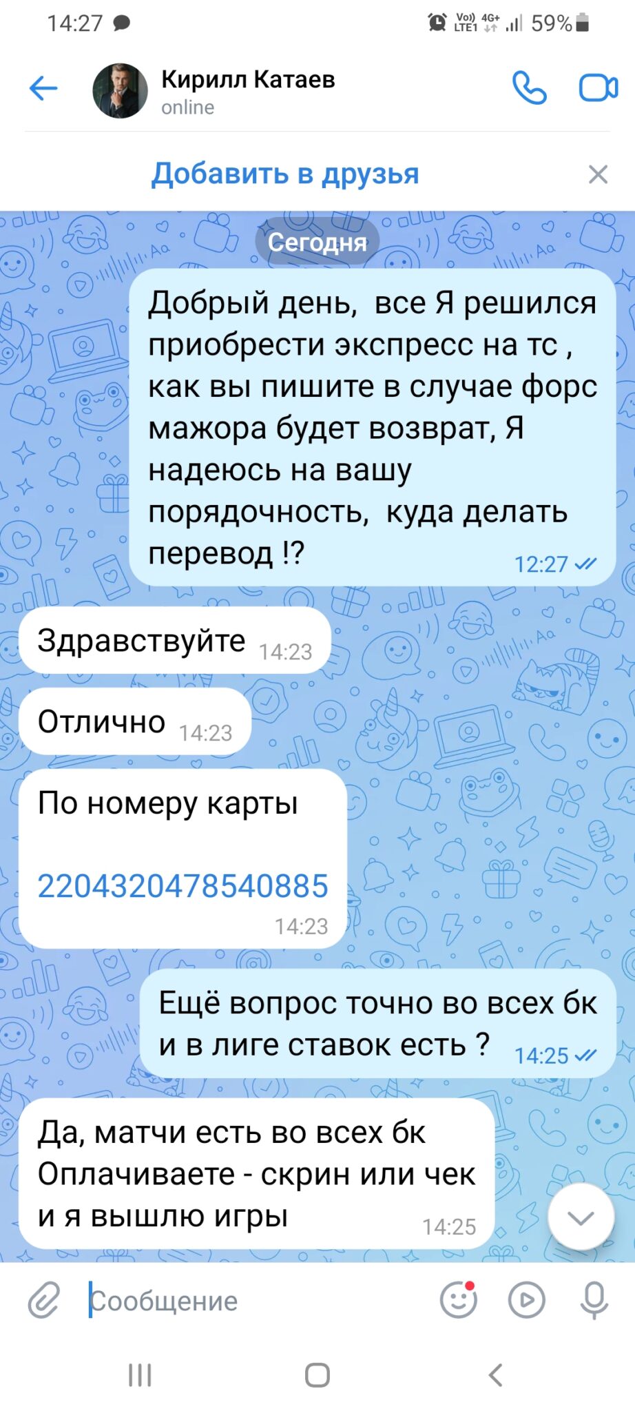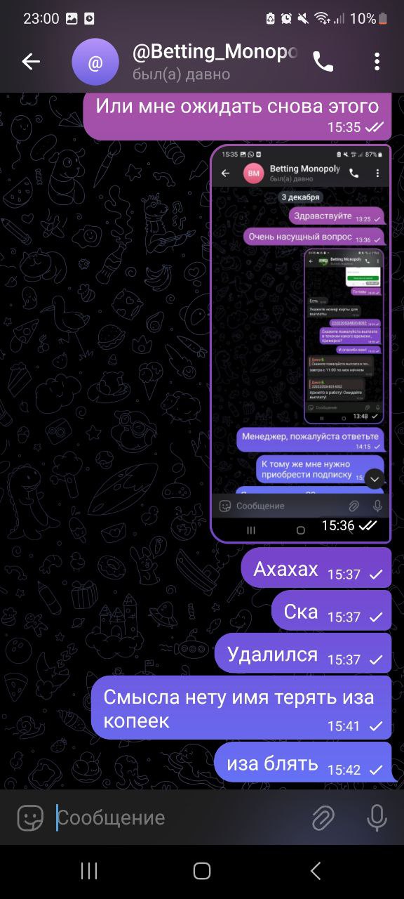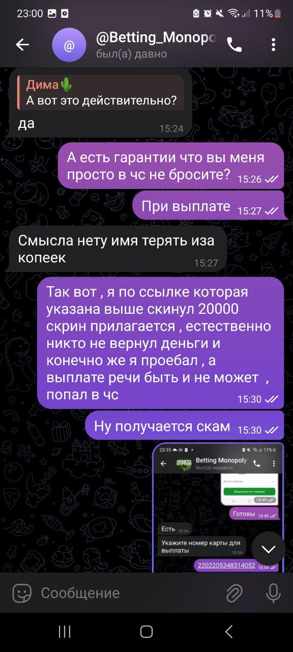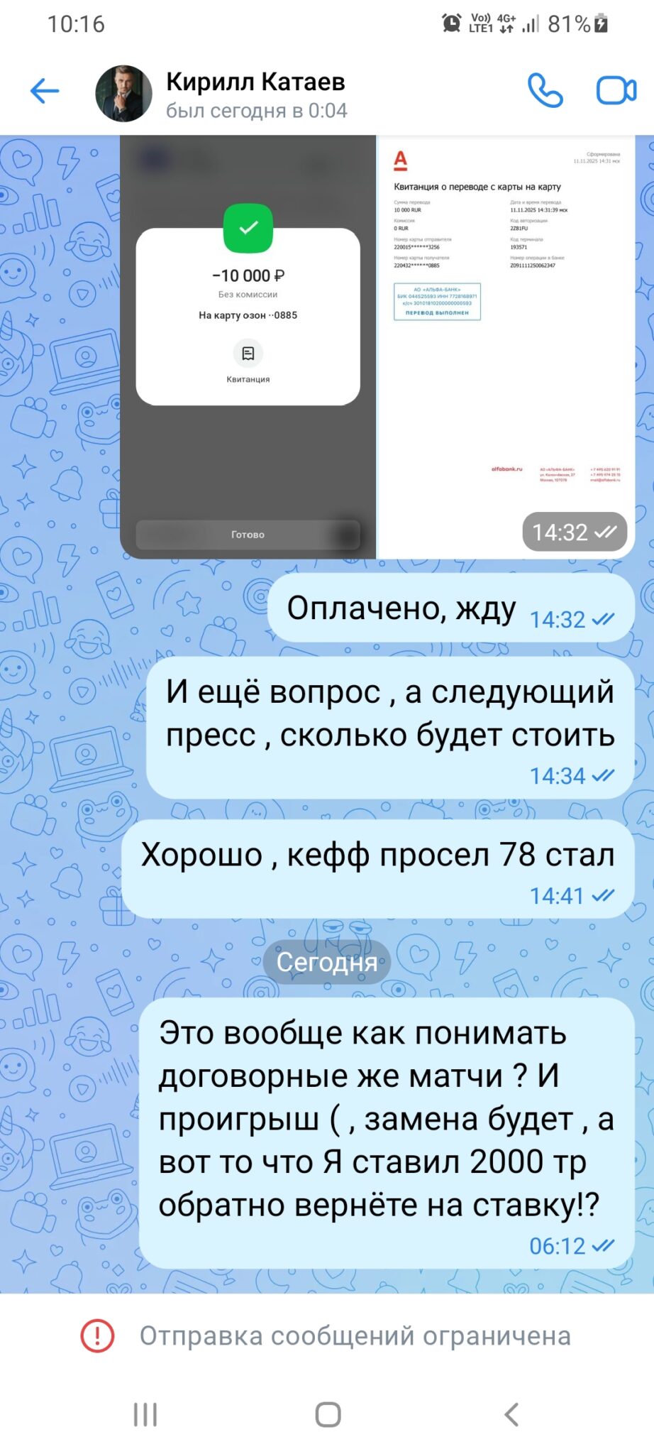 Написать жалобуЗдесь мы публикуем жалобы на капперов. Если Вас обманул прогнозист или вы заметили факт мошенничества, прошу максимально подробно описать суть проблемы, прикрепить скриншоты (если они есть), ссылку на канал и отправить жалобу нам.