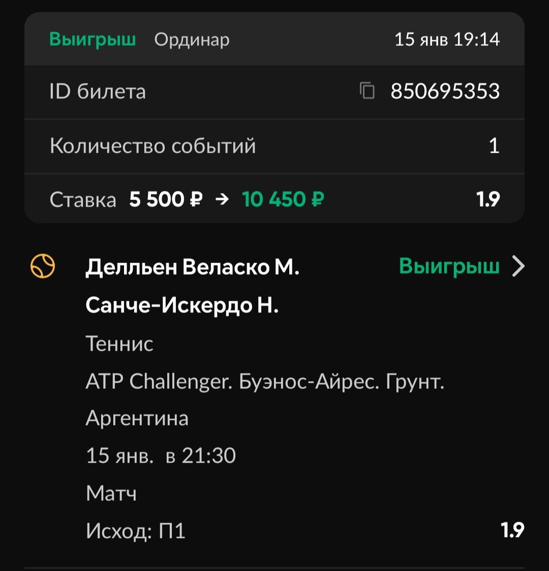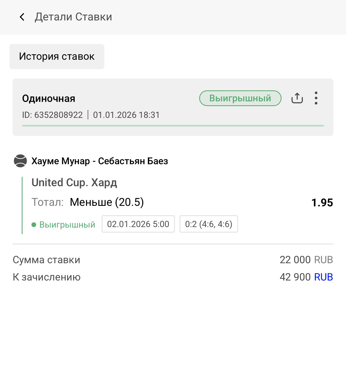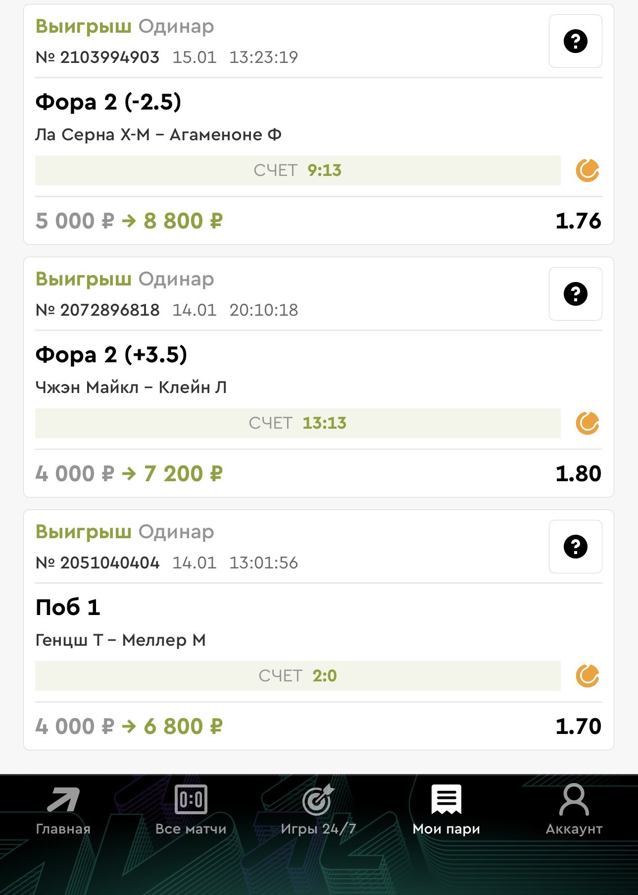 Нормально отыграли 2 месяца. Были и серии плюсов и даже минусов, но просадку я пережил, подписку отбил, рекомендую Макса отличный парень. Всегда был на связь. Мне есть с чем сравнить. Я в чс наверно у половины каперов по тенису, за год полтора мульта минуса всадил. С Максом хоть отбил соточку чистоганом. Но моя игра окончена. Иду служить. Решил написать отзыв напоследок. Всем добра