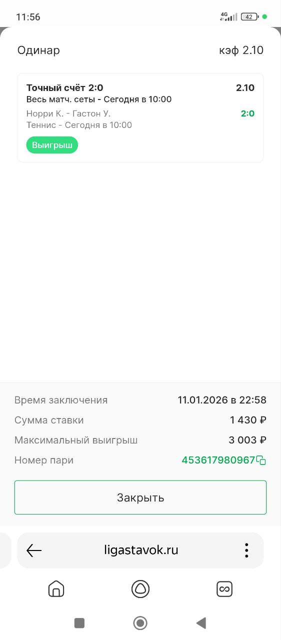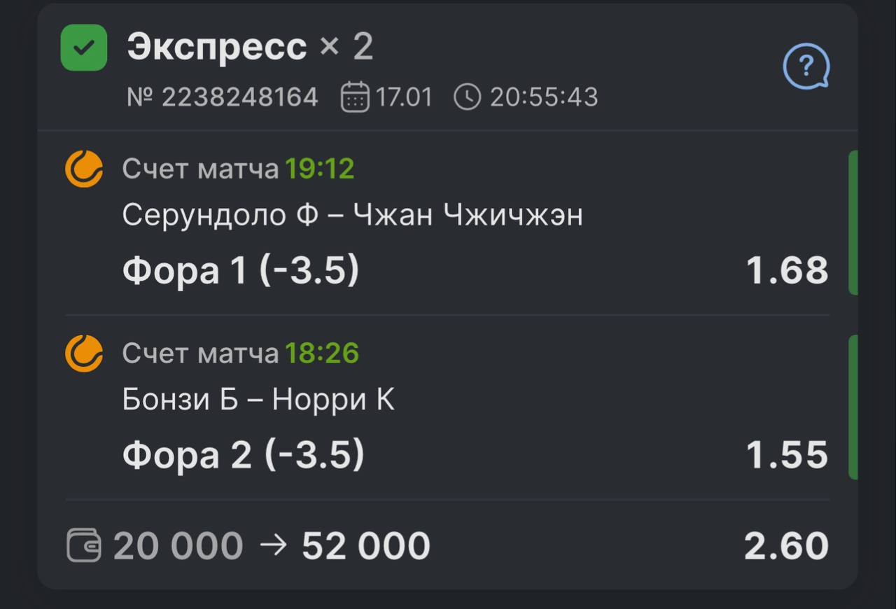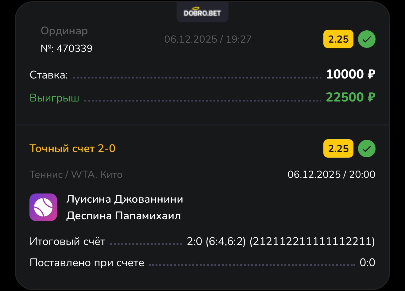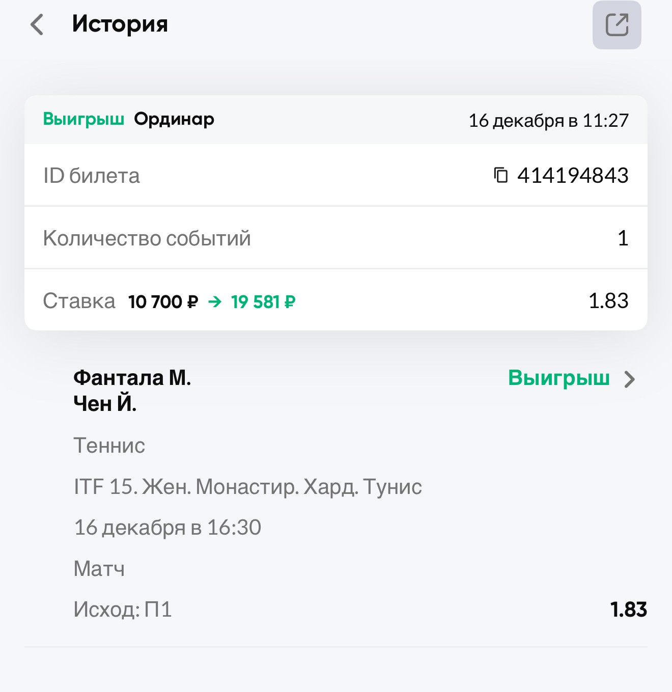 Нормально отыграли 2 месяца. Были и серии плюсов и даже минусов, но просадку я пережил, подписку отбил, рекомендую Макса отличный парень. Всегда был на связь. Мне есть с чем сравнить. Я в чс наверно у половины каперов по тенису, за год полтора мульта минуса всадил. С Максом хоть отбил соточку чистоганом. Но моя игра окончена. Иду служить. Решил написать отзыв напоследок. Всем добра