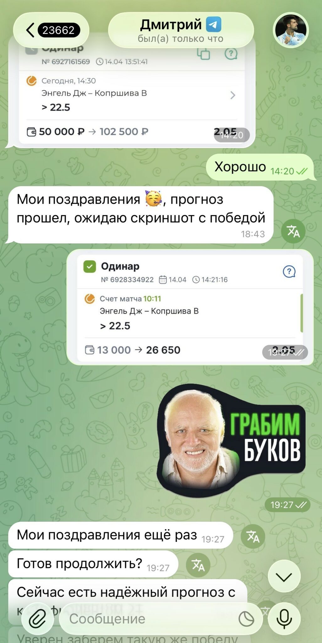 Рекомендую данный канал и каппера. Дмитрий хорошо разбирается в теннисе и общительный, для меня это был явный плюс, поделился полезными советами и рассказал много полезных вещей, в общем на опыте мужик видно!!!!