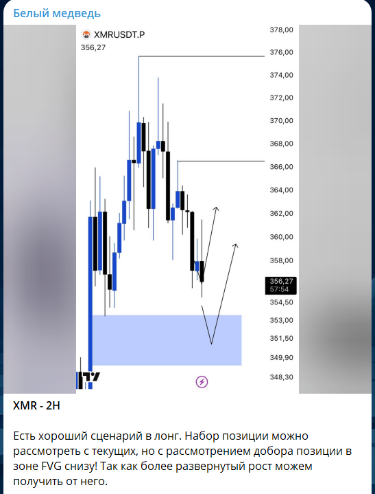 На канале ТГ Белый медведь при публикации сигнала не дают обоснования по выбору, а просто чертят графики, куда ориентировочно должна пойти цена: