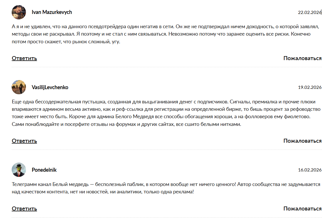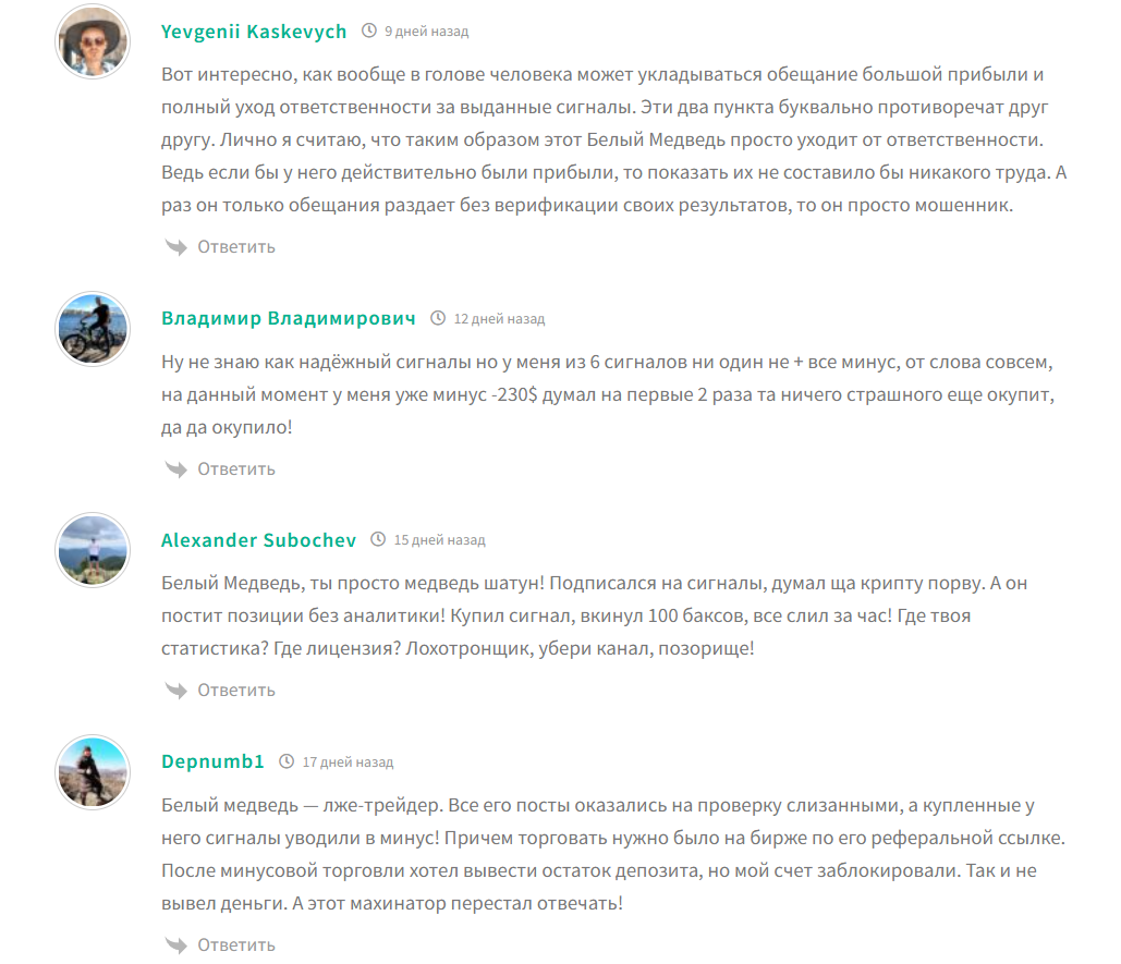 На телеграм-канале Белый медведь часто пересылают сообщения от довольных подписчиков, которые хвалят эксперта и пребывают в восторге от полученной прибыли. На такую оценку лучше не обращать внимания, тем более мнение людей на сторонних сайтах отличается. В статьях отмечают низкий проход, а под публикациями оставлено множество жалоб: