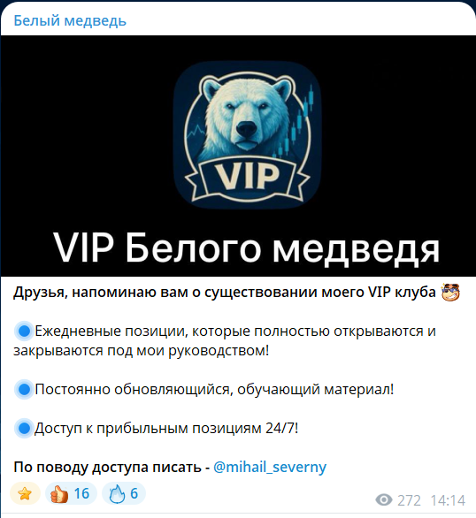 Трейдер Михаил Северный @mihail_severny приглашает участников вступить в VIP клуб с лучшими идеями по криптовалютному рынку: