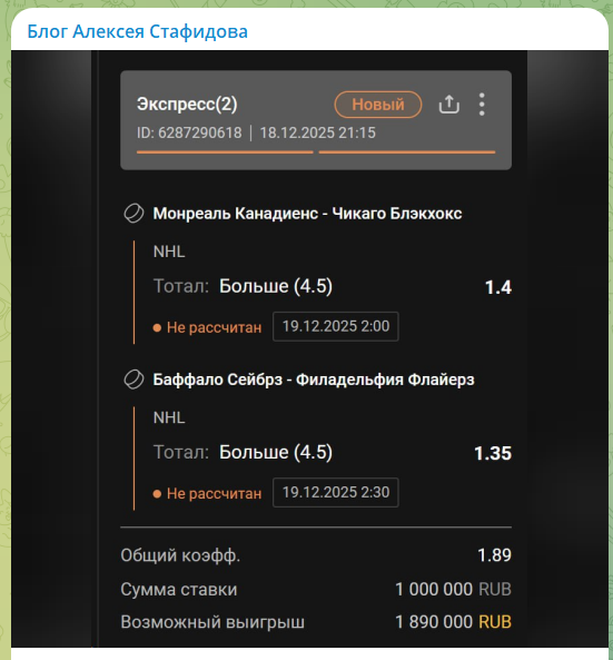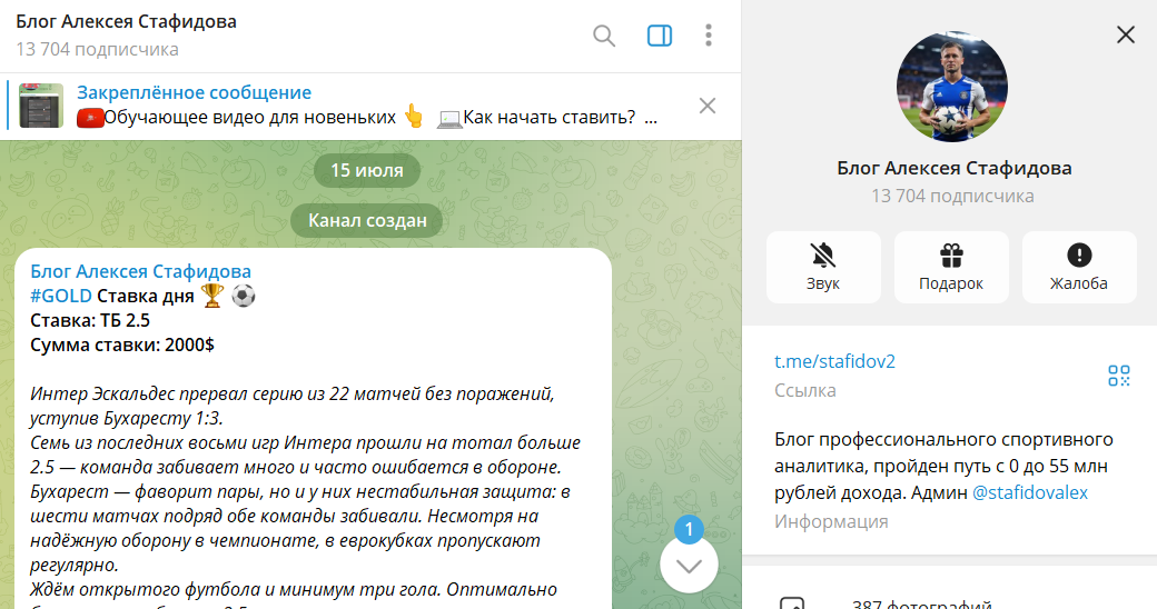 Прогнозы на канале ТГ Блог Алексея Стафидова выходят с описанием и без. Прогнозы делаются на популярные соревнования в футболе и хоккее. Большинство пари заключено на победы, форы и тоталы (большие рынки):