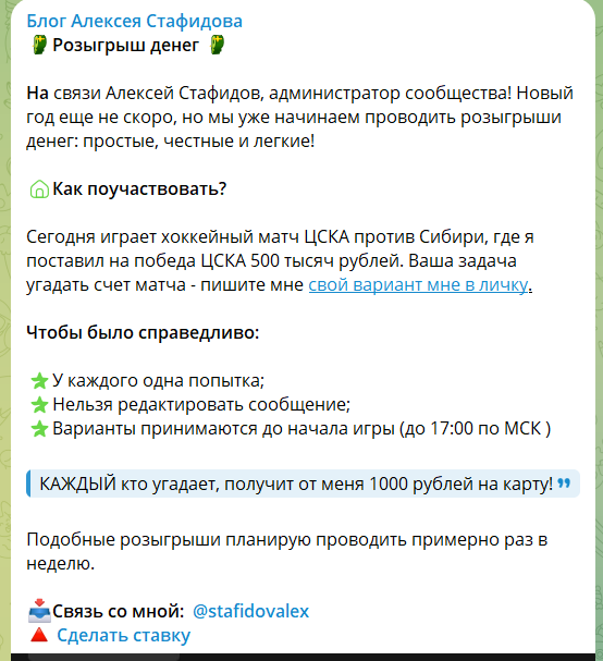 Капер Алексей Стафидов (@stafidovalex) различными способами пытается завлечь подписчиков в личные сообщения. Один из вариантов – проведение розыгрышей, где необходимо угадать точный счет. Каждому победителю обещают выплатить по 1000 рублей после окончания игры:
