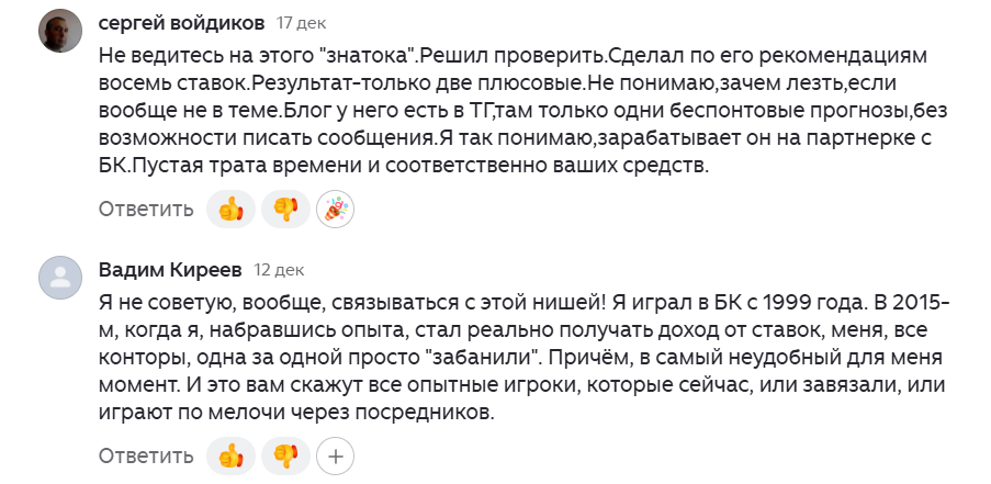 Прогнозист о себе не выкладывает отклики подписчиков. Больше информации представлено на тематических сайтах с обзорами о проекте, которые получили минимальный рейтинг. Причем под публикациями, как правило, посетители оставляют исключительно жалобы, вот примеры: