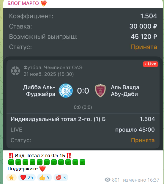 На канале БЛОГ МАРГО бесплатные прогнозы выходят беспрерывно в live режиме. Как только одно пари рассчитывают, сразу появляется новый совет. 90% рекомендаций идет на результативность, причем на один матч ставят сразу два раза на разные исходы. Как в этом случае на тотал больше (0.5) и (1.0):