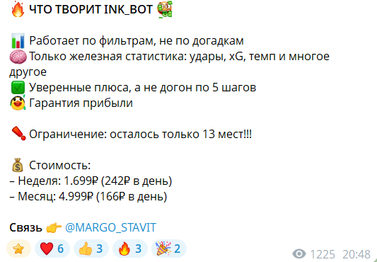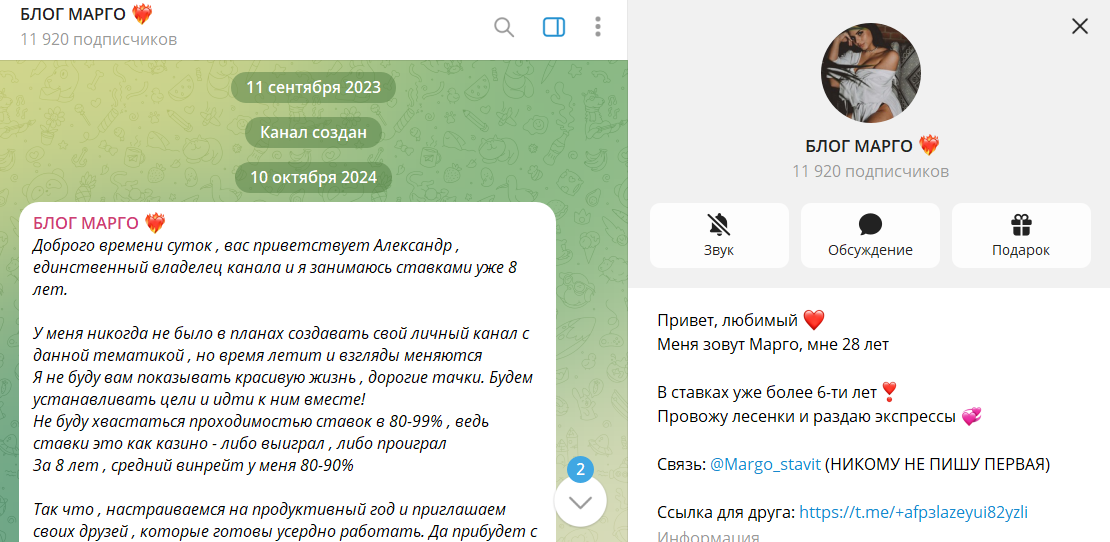 Аналитический портал посвящен прогнозированию спортивных матчей. В первом посте автор рассказывает о себе, оказывается, ранее здесь роль каппера исполнял некий Александр. Смена названия и администратора произошла примерно весной 2025. Сейчас здесь всеми процессами заведует Марго (@Margo_stavit). Девушка делится бесплатными ставками и предлагает платные подписки. Отчеты выложены по каждому заключенному пари в букмекерской конторе. Играть советуют на определенной оффшорной платформе.