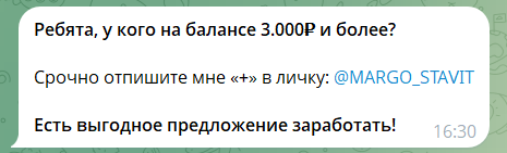 Каппер Марго (@Margo_stavit) своей аудитории в боте ЖЕЛЕЗОБЕТОН (@Margoblogink_bot) предлагает индивидуальные сигналы для ставок. Допускаются подписчики с балансами от 3000 рублей: