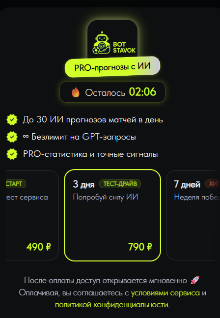 - канал в телеграме Бот Ставок — ИИ прогнозы: @botstavok