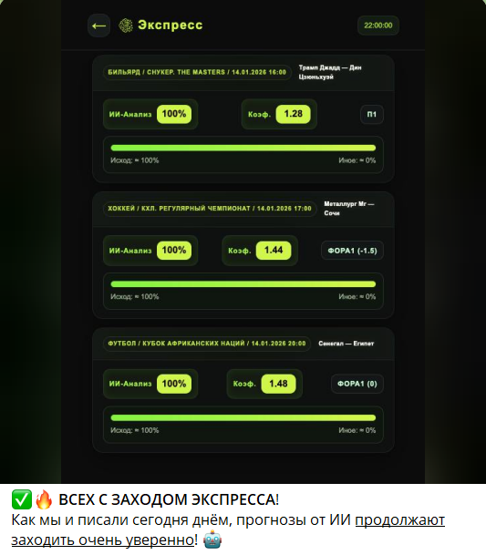 В боте Ставок ИИ в спорте часто выходят прогнозы на хоккей и футбол в формате экспрессов из трех событий: