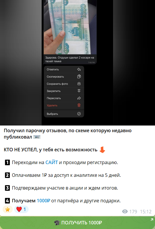 С первого взгляда может показаться, что все безопасно, ведь на некоторых ресурсах действительно можно заработать небольшие деньги, но если разобраться в деталях, то не все так сладко. Вот, например, в последнем посте обещают 1000 рублей за регистрацию на сайте и покупку подписки за 1 рубль: