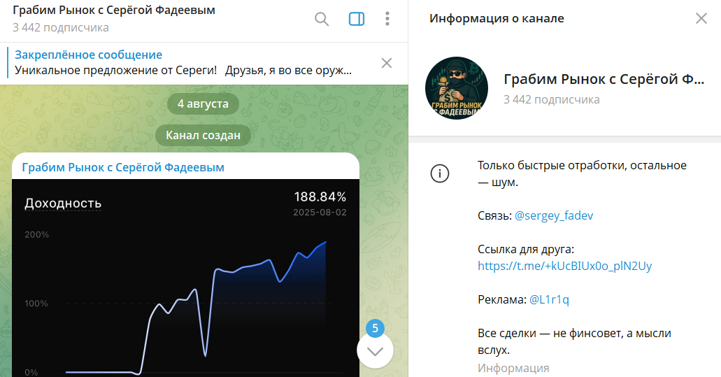 Внешний вид телеграм канала Грабим рынок с Серегой Фадеевым