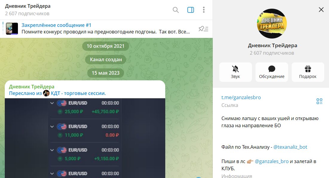 В роли создателя и руководителя выступает Валерий (@ganzales_bro). Молодой человек позиционирует себя успешным трейдером по бинарному рынку. Автор никак не подтверждает свою квалификацию. Все прогнозы выходят в закрытом режиме. По завершении торговой сессии выкладывается статистика с указанием количества сделок, плюсов, минусов и общей проходимости. Для новичков предусмотрено бесплатное обучение Тех. Анализ 2.0, которое можно получить через бота TexAnaliz_bot.