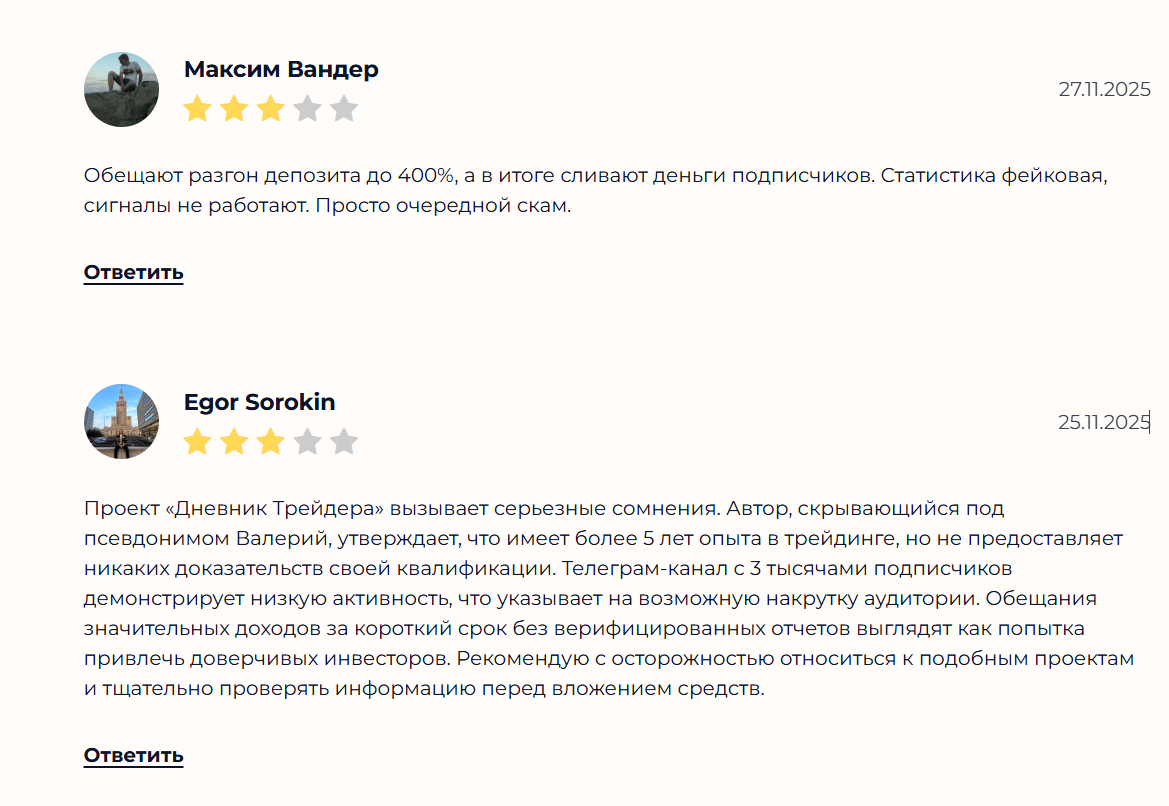 Трейдер Валерий @ganzales_bro периодически делится переписками с участниками VIP клуб, которые в целом остаются довольны и прибылью, и процентом удачных сделок. Мнение пользователей на сторонних сайтах кардинально отличается. Под обзорами с минимальным рейтингом можно увидеть только жалобы: