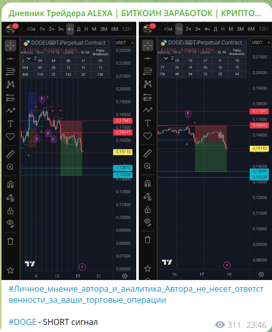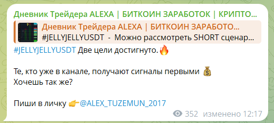 Дневник Трейдера ALEXA – это канал в телеграмме с торговыми сигналами по фьючерсному рынку крипты. Эксперт Алекс (@ALEX_TUZEMUN_2017) предлагает своей аудитории бесплатные сигналы и прогнозы в закрытом доступе. По сделкам ведется своя статистика, под постами открыты комментарии. Проект безопасен, но прежде чем торговать на реальные деньги, лучше несколько недель последить за результатами, так как подробной и верифицированной отчетности по сделкам нет, а в интернете встречаются отрицательные отзывы.