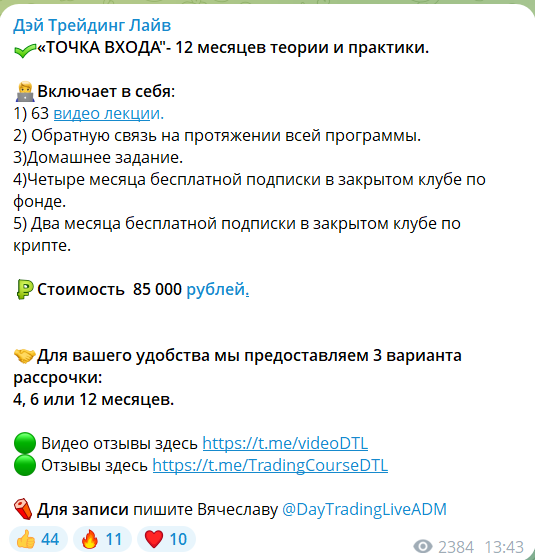 Подписчиков канала Дэй Трейдинг Лайв приглашают пройти платное обучение «Точка входа» длительностью 12 месяцев, которое включает: