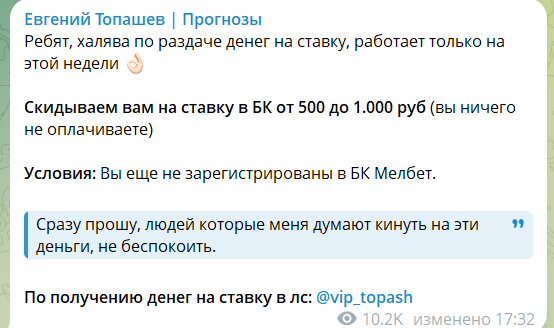 Чаще всего владельцы блогов со ставками заботятся только о своей выгоде, им все равно, что получат подписчики. Причем встречаются и такие проекты, где намеренно и осознанно создают условия для проигрыша. Канал ТГ Евгений Топашев | Прогнозы (@vip_topash) относится к последней категории сообществ. После анализа сервис отправляется в черный список, о результатах проверки далее.