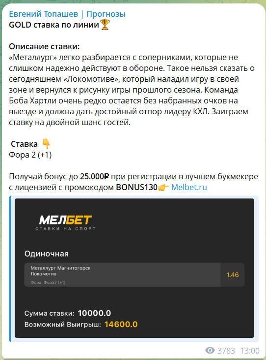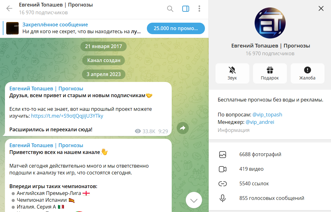 С первого взгляда бесплатные прогнозы на канале в телеграме от каппера Евгения Топашева вызывают хорошие эмоции, ведь есть описание и выбраны крупные рынки больших соревнований: