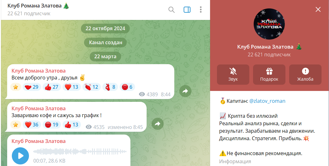 Клуб Романа Златова (zlatov_roman) – это проект в телеграме по теме заработка на фьючерсах криптовалют. По совершенным сделкам ведется статистика, и делятся хорошими отзывами. Проверка показала, что заявленный проход не соответствует действительности, так как все убыточные сделки намеренно скрывают. Отзывы в сети пока не появились, но с большой долей вероятности недавно было изменено название.