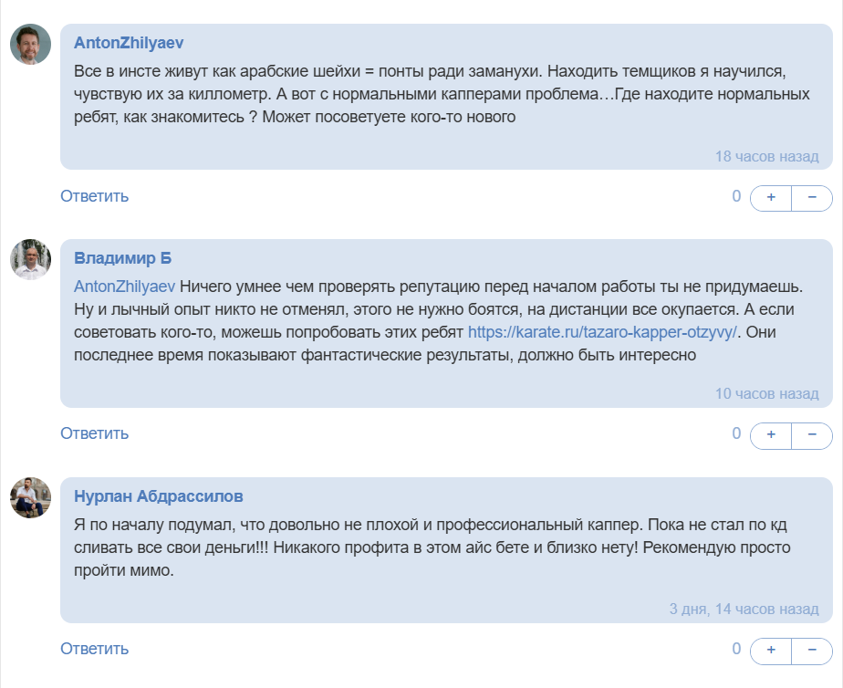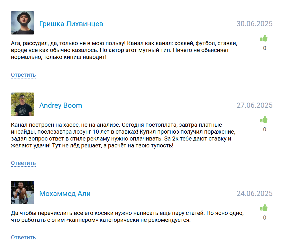 Каппер Ice Manager (@Ice_Bet_Manager) в случае выигрышей по платному прогнозу в ленте демонстрирует диалоги с покупателями, где его благодарят за качественную аналитику. А вот на сторонних сайтах сложился общий низкий рейтинг, причем под обзорами посетители пишут только негативные комментарии, примеры: