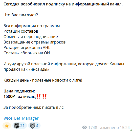 Портал посвящен аналитике хоккейных матчей. Имена прогнозистов скрыты от всеобщего обозрения. По поводу подписок можно обратиться к администратору Ice Manager (Ice_Bet_Manager). Для аудитории предусмотрены бесплатные советы, платные штучные прогнозы и длительные подписки. Дополнительная прибыль идет от рекламы букмекеров и других подобных групп. Нормальная отчетность не ведется, отмечается каждая ставка по отдельности.
