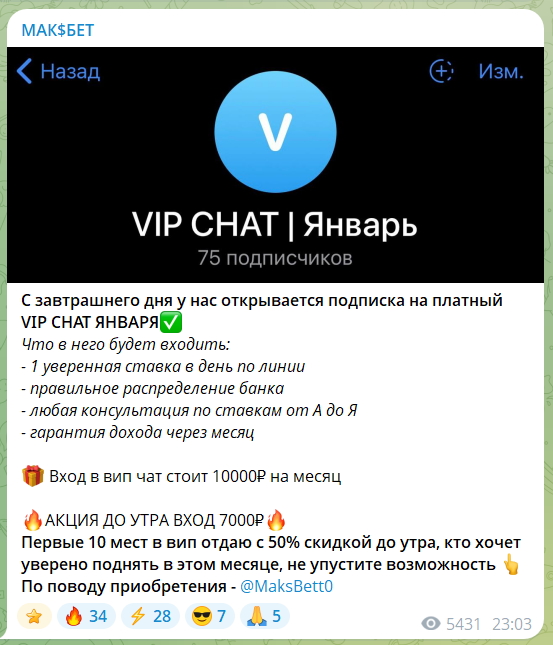 На канале TG МАК$БЕТ всех приглашают вступить в VIP чат с лучшими прогнозами на спорт:
