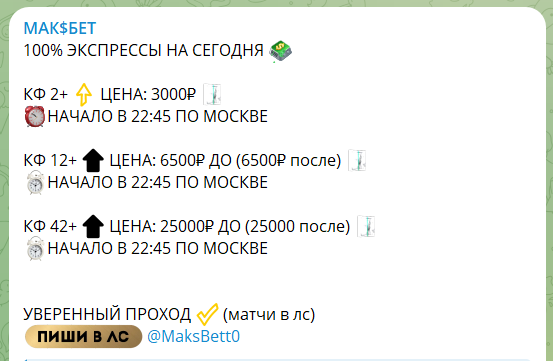 Зачастую капперские сообщества создаются с единственной целью – для заработка на доверчивых и неопытных подписчиках. Причем в большинстве случаев аудитории намеренно сливают депозиты, чтобы дополнительно заработать на партнерской программе от букмекерской конторы. На канале в телеграме МАК$БЕТ аналитики Максим @MaksBett0 и Андрей @AndreyMarch1 работают именно по такой схеме. При проверке отмечены попанские экспрессы, фейковые конкурсы, рисованная статистика и многочисленные отрицательные отзывы в интернете.