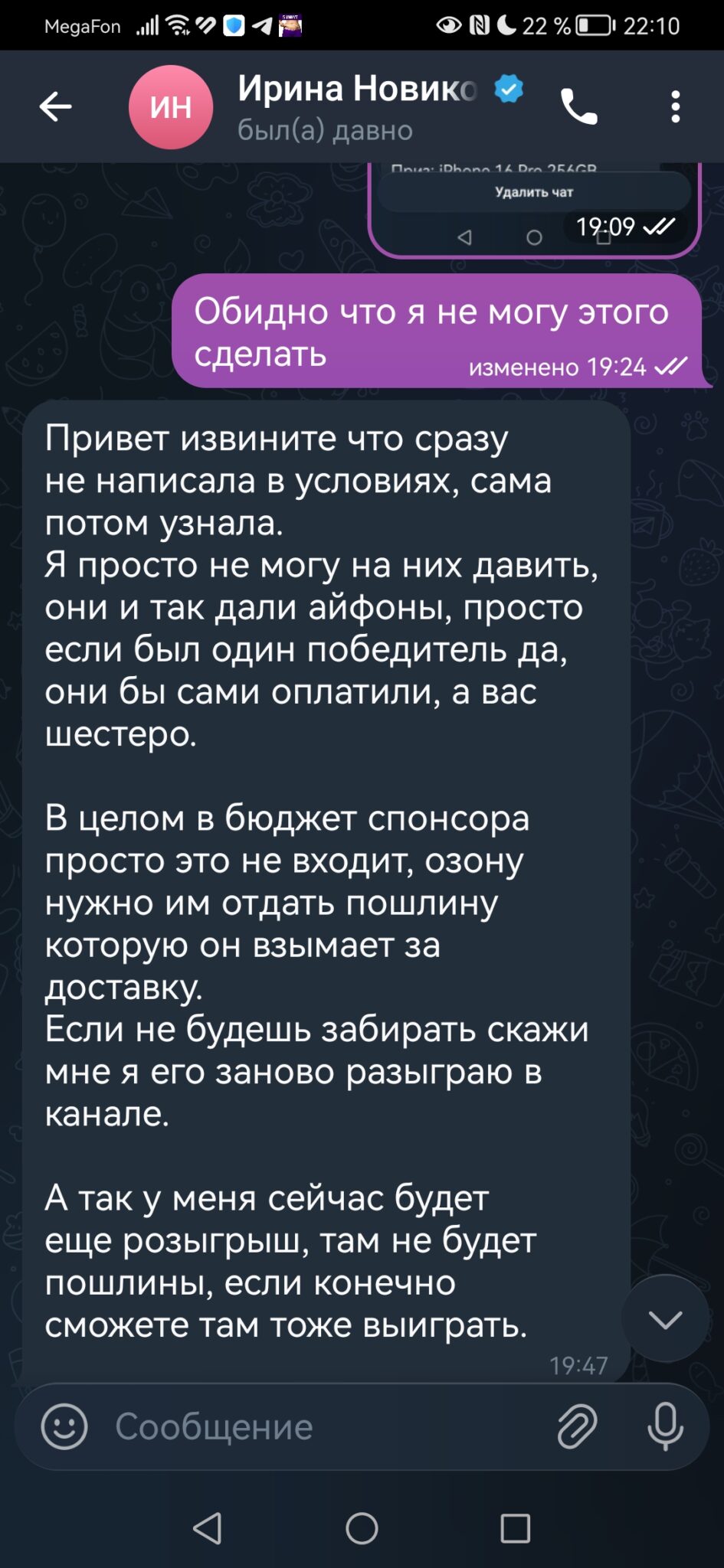 Хочу продолжить ваш комментарий я приняла участие в розыгрыше на айфон 16 pro и бот меня выбрал 3-й из 6 всего 6 победителей . В итоге такая же история перевела на менеджера там мне присылают ссылку на оплату госпошлины 15000 я ей пишу Ирина вот это подарок в 15000 т.р . Спасибо дарю его вам . Далее она скидывает информацию себе в блог как якобы освободилось место призера который отказался по своим каким то причинам оформлять айфон и мой ай фа он она якобы б запустила опять а розыгрыш . Далее потом мы с ней списались я сказала что у… Читать далее »