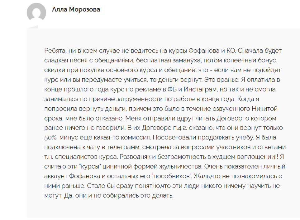 Крипто проект посвящен трейдингу на фьючерсном рынке. В роли основателя и главного эксперта выступает Никита Фофанов. Бесплатные и платные торговые рекомендации не предусмотрены. На официальном сайте fofanov pro автор предлагает всем вступить в клуб трейдеров «Торгуем вместе», где предлагают работать по уникальному индикатору, который эффективен на всех стадиях рынка. На сервисе расписаны все преимущества и даны многочисленные обещания, которые не вызывают никакого доверия.