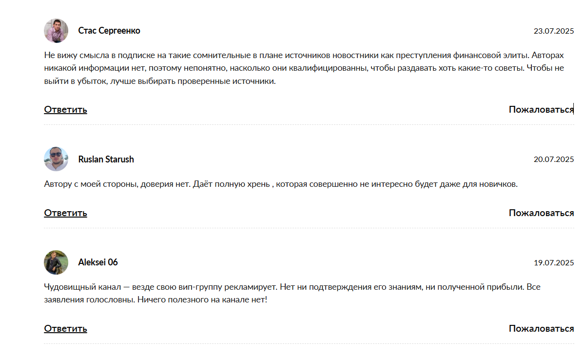 Преступление финансовой элиты – это телеграм-канал с торговыми идеями по криптовалютному рынку. Имена трейдеров скрыты, работа ведется фьючерсами с маржинальным плечом. Отчетность ведется по каждой сделки, но общей статистики нет. Анализ показал, что заявленным результатам по сессиям нет никакого доверия, так как большинство убытков скрыто. Мнение команды KAPER.PRO подтверждают негативные отзывы на тематических сайтах, которые оставляют подписчики.