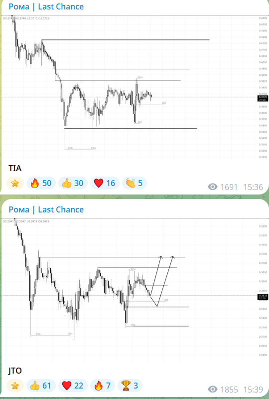 На канале в телеграмме Рома | Last Chance прогнозы выходят без обоснования, просто на графике указано потенциальное движение цены: