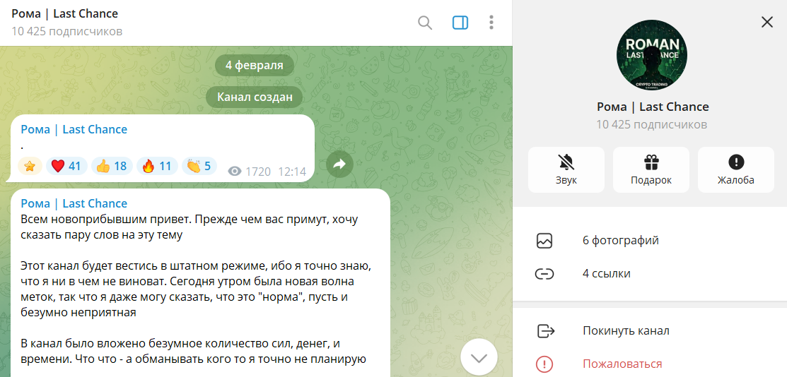 Совсем молодой криптосервис был создан 4 февраля 2026 (сегодня 5 февраля), но уже насчитывает более 10 тыс. подписчиков с невероятной активностью (почему все накрутка, объяснение в следующем разделе). Комментарии предусмотрительно закрыты. На канале занимаются фьючерсной торговлей, В роли трейдера выступает Роман (ссылка на профиль пока скрыта). В ленте выходят новости, прогнозы и отчеты. Активно рекламируется одна биржа и множество подобных неоднозначных групп с сомнительными услугами.