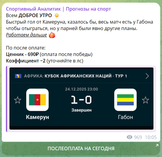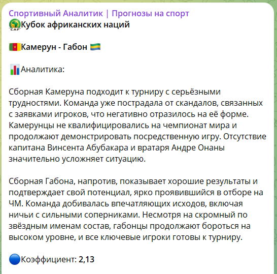 На канале в телеграме «Спортивный аналитик» прогнозы на спорт выходят с небольшим описанием. Коэффициенты достойные, но складывается впечатление, что грузят на все подряд, даже на Камерун: