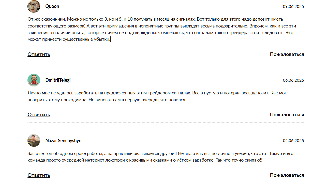 Проект Тимур Казах (Trader_Timur_ne_bot) посвящен торговле на рынке бинарных опционов. Рекомендации выходят в приватном режиме. По сессиям ведется собственная статистика. При анализе отмечено, что бот в телеграме и канал ютуб Тимур в деле | Трейдинг на практике направлены на слив депозитов подписчика, так как основной доход идет от брокера, который платит только с минусовых счетов клиентов.