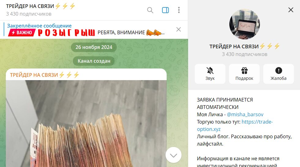 Первая публикация в ленте датирована 26 ноября 2024, первое время группу вел совсем другой менеджер (трейдер), после сменили названия и эксперта. На группу подписано 3.4 тыс. пользователей, которые за 24 часа просматривают порядка 450 раз, что говорит о повышенной активности. Комментарии для общения закрыты. Помимо телеги есть еще Ютуб с тематическими видеороликами.