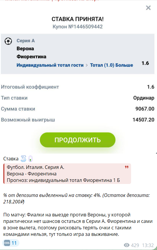 На канале TG Чистая математика при публикации прогноза на спорт указывается рекомендуемая суммы ставки, дополнительно дается краткий комментарий: