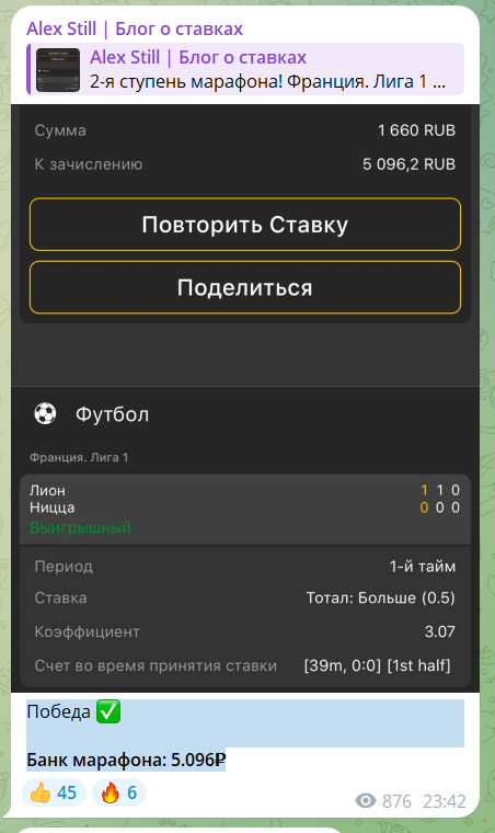 А в статистике уже ставка на ТБ (0.5) за кф.3.07, хотя изначально на этот исход котировка была не выше 1.30. После чего этот умник весь выигрыш заносит в общий банк марафона. Причем в случае двойного проигрыша луз просто может быть удален из общей ленты. Именно поэтому у новых подписчиков складывается неверное впечатление о высокой проходимости. Без верификации всему лучше не доверять.