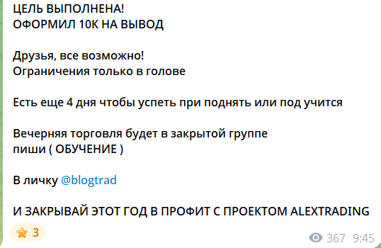 После проведения прямых эфиров на канале TG ALEX TRADING обычно сообщают, что дальше торговая сессия пройдет в закрытом чате, где дополнительно каждый получит обучение: