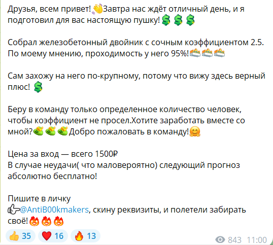Каппер Артем @AntiB00kmakers о себе периодически показывает переписки, где ему высказывают хорошие слова и благодарят за профессионализм. Подобная оценка не вызывает доверия. При изучении сторонних источников наша команда не нашла информации о ресурсе. Большая вероятность, что недавно было изменено название.