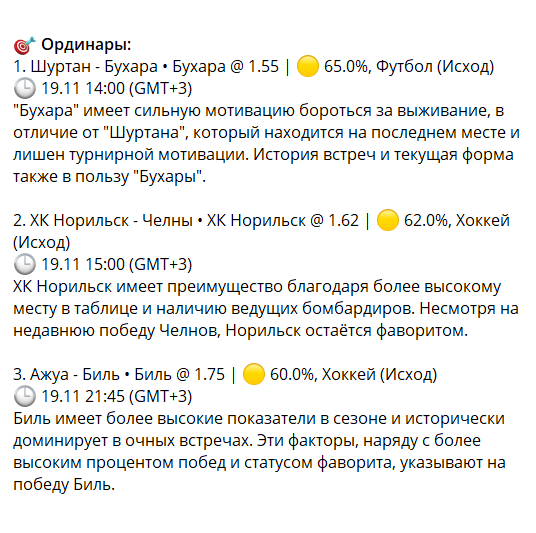 1. Шуртан — Бухара • Бухара @ 1.55 | 65.0%, Футбол (Исход). 19.11 14:00 (GMT+3). «Бухара» имеет сильную мотивацию бороться за выживание, в отличие от «Шуртана», который находится на последнем месте и лишен турнирной мотивации. История встреч и текущая форма также в пользу «Бухары».