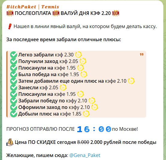 Каждый день выходит анонс о продаже валуя дня с коэффициентом 2.0+. Оплата проводится только после получения выигрыша, перевести придется 2000 рублей: