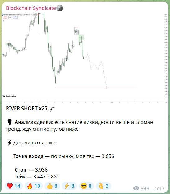 На канале Blockchain Syndicate в телеграмме торговые рекомендации выходят без обоснования по сделанному выбору. В посте трейдер Егор Кочетов указывает направление (шорт/лонг), маржинальное плечо, точки входа, стопы и тейки: