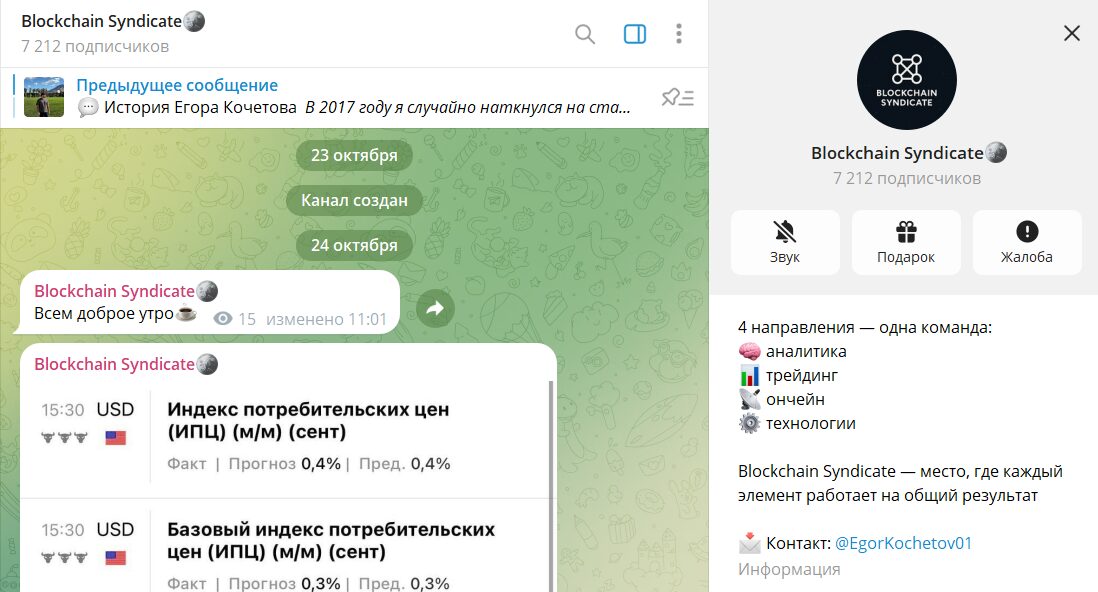 «Blockchain Syndicate» – это проект в телеграме с предложениями заработка на криптовалюте. Трейдер Егор Кочетов (EgorKochetov01) делится бесплатными сигналами по фьючерсному рынку криптовалют и оказывает перечень платных услуг: обучающие курсы, закрытые VIP клубы. Отзывы в интернете о канале пока не появились, но заявленной статистике доверять на 100% нельзя, так как верификация по сделкам на профильных сайтах отсутствует.